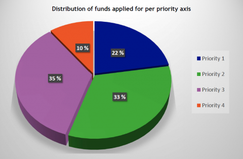 We are happy to announce that all applications for the 2nd step of the 2nd call were received in a timely fashion, the last being submitted some 19 minutes before the deadline. In total, approximately 24 million euros ERDF were applied for. The diagram on the right side shows the division of applied funds per priority.